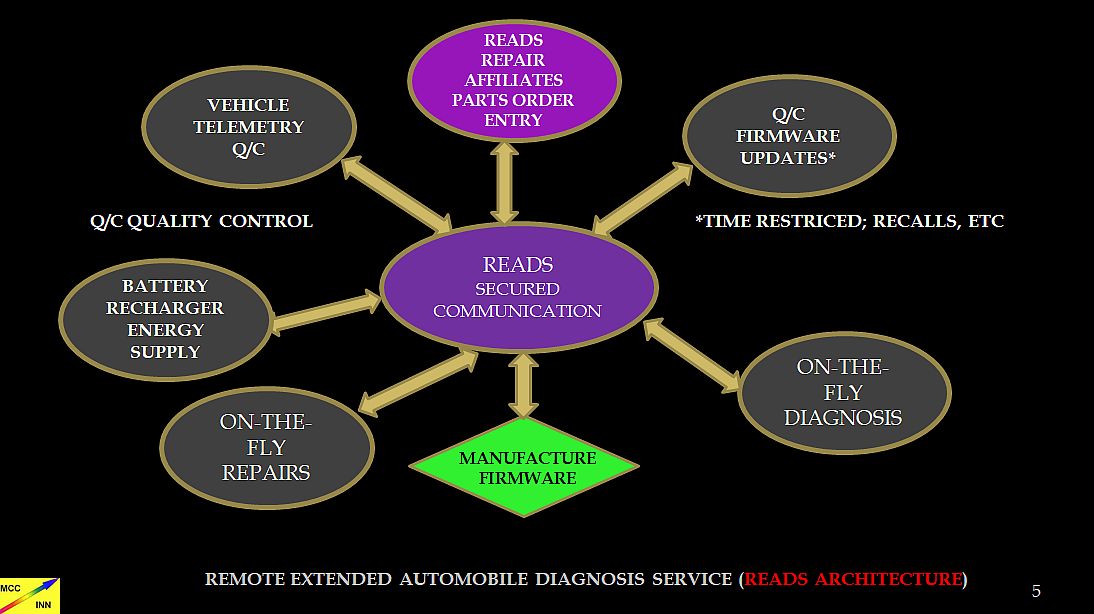 ![]() Heart of the system is a secured communications link between EV manufacturers and their EVs. Through telemetry links, manufacturers are able to provide virtual mainenance and servicing by on the fly upgrades of EV firmware for Qualty Control managemnt of their fleets.Optimized QC permits minimal deployment of brick and mortar service centers. The admixture of virtual firmware servicing and brick and mortar servicing is further optimized by a physical vehicle shipment between service centers and customers. The later structure provides slack in operations for EV manufactureres handling EV Exception Repair Conditions and EV firmware updates.